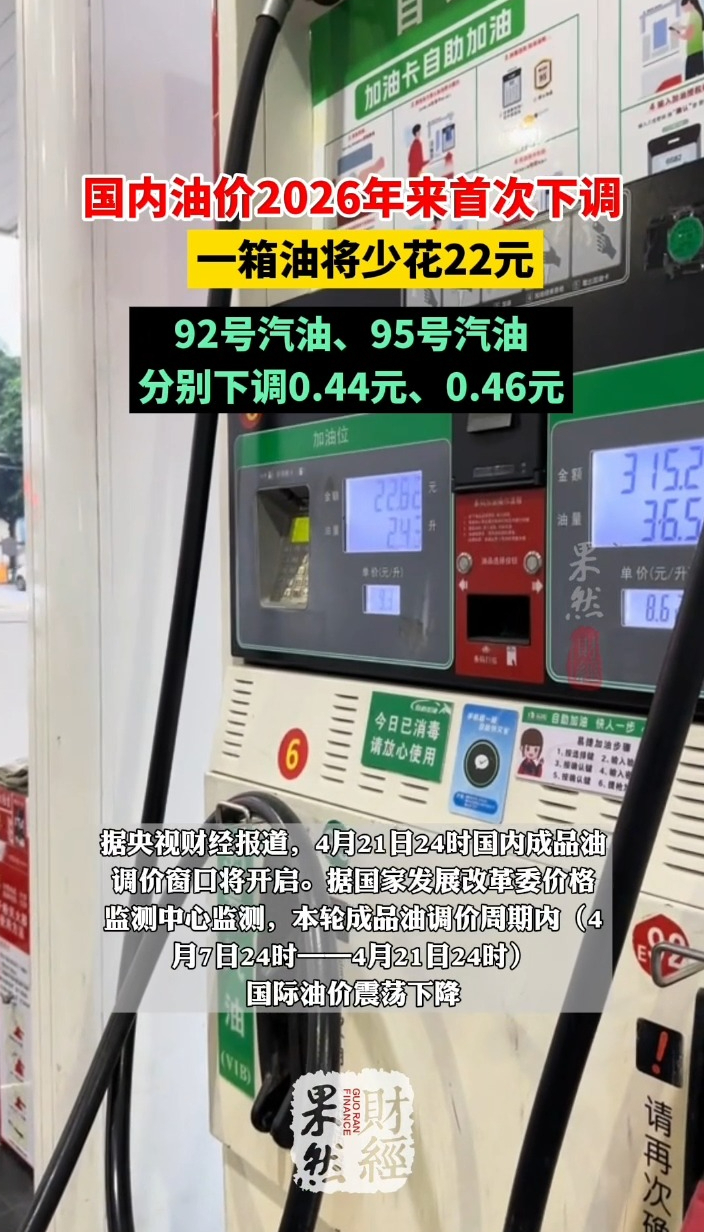 果然财经|国内油价2026年来首次下调,一箱油将少花22元 16:47 原创齐鲁晚报·齐鲁壹点客户端 微信扫码扫码下载客户端据央视财经报道,4月21日24时国内成品油调价窗口将开启。据国家发展改革委价格监测中心监测,本轮成品油调价周期内(4月7日24时——4月21日24时),国际油价震荡下降。4月21日24时起,国内汽、柴油零售价格每吨分别下调555元、530元,全国平均来看:折合升价92号汽油、95号汽油、0号柴油分别下调0.44元、0.46元、0.45元。