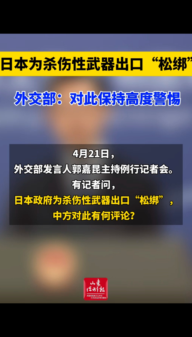 4月21日,外交部发言人郭嘉昆主持例行记者会。有记者问,日本政府为杀伤性武器出口“松绑”,中方对此有何评论?