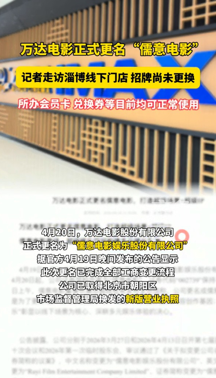 万达电影更名为“儒意电影”,淄博“万达影城”招牌尚未更换大众报业·齐鲁壹点 18:504月20日,A股“院线第一股”万达电影正式更名为“儒意电影”,更名后第一天,记者走访淄博万达影城线下门店看到,“万达影城”招牌尚未更换,工作人员表示,目前,在万达影院所办会员卡,电影兑换券等观影服务不受影响,均可正常使用,具体调整情况以官方公告为准。