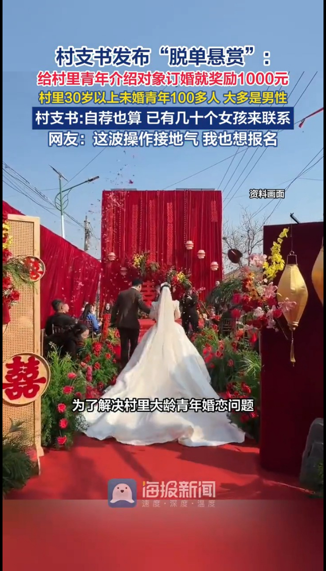 河南驻马店一村党支部书记放大招了:为了解决村里大龄青年婚恋问题,村委决定发布“脱单悬赏”,但凡有人给村里青年介绍对象,双方能订婚,就奖励介绍人1000元!