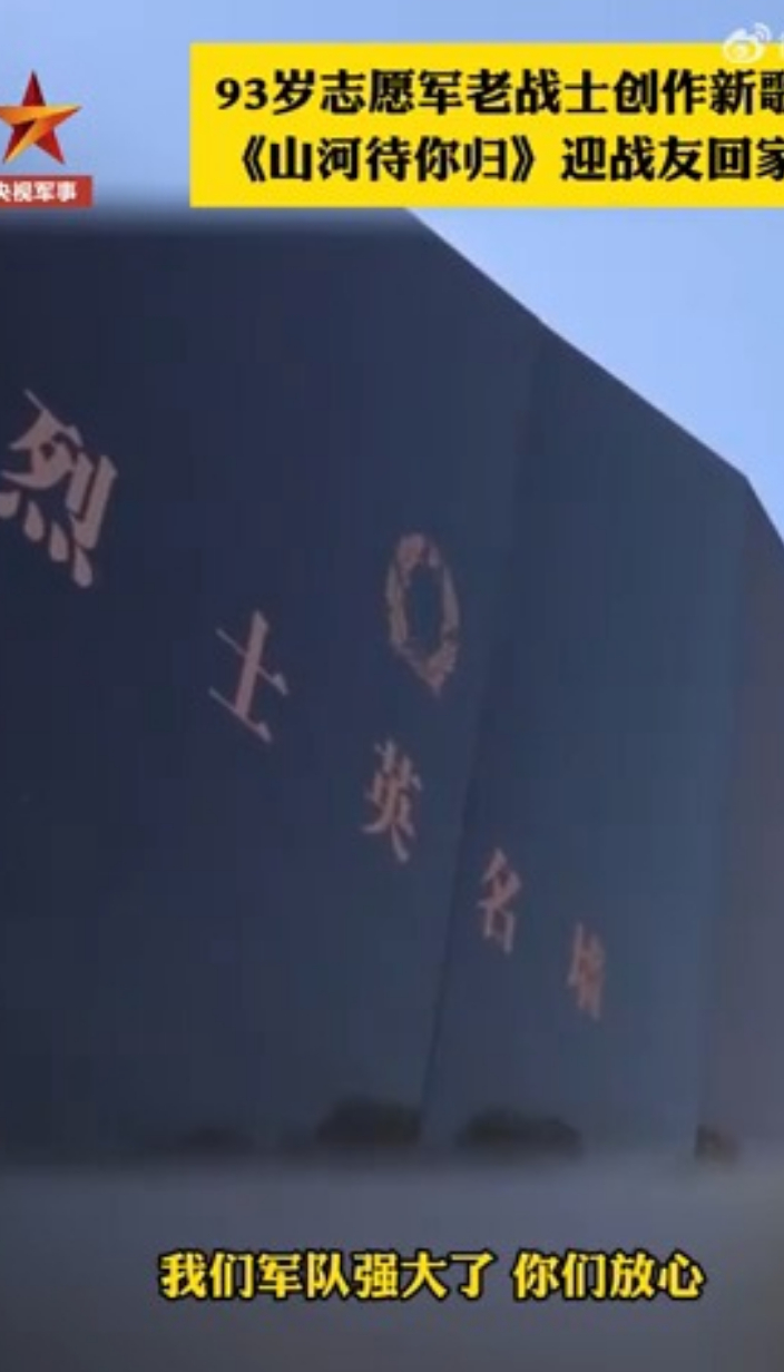 泪目!93岁志愿军老战士写新歌接战友回家央视军事 06:49希望把这些告诉他们,现在我们祖国强大了,军队强大了,你们放心…… 93岁抗美援朝志愿军老战士邬大为,在得知第十三批志愿军烈士遗骸即将归国后,第一时间创作了歌曲《山河待你归》。今年,也将是他第5次现场参加志愿军烈士遗骸迎回活动。 (央视军事)