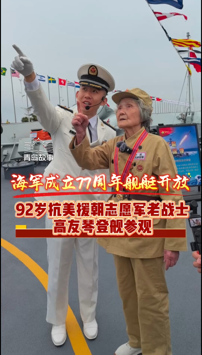 海军成立77周年舰艇开放,92岁抗美援朝志愿军老战士高友琴登舰参观:“骄傲!”“不怕人家欺负我们了,我们可以跟他对打!”