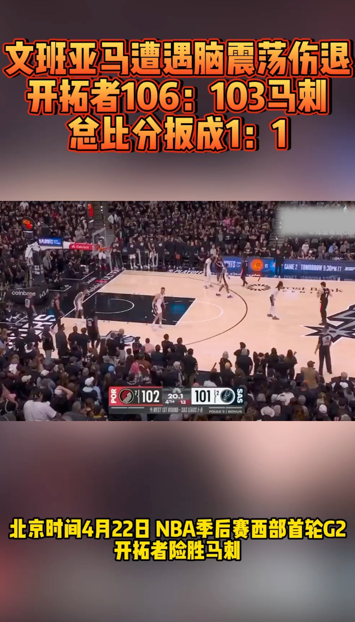 果然视频|文班亚马遭遇脑震荡,马刺103:106不敌开拓者齐鲁壹点 | 11:40 原创齐鲁晚报·齐鲁壹点客户端 微信扫码扫码下载客户端北京时间4月22日,NBA季后赛西部首轮系列赛G2,开拓者106:103力克马刺,将大比分扳平至1:1。本场,杨瀚森并未出场,文班亚马次节遭遇脑震荡伤退。(齐鲁晚报·齐鲁壹点 冯子涵)