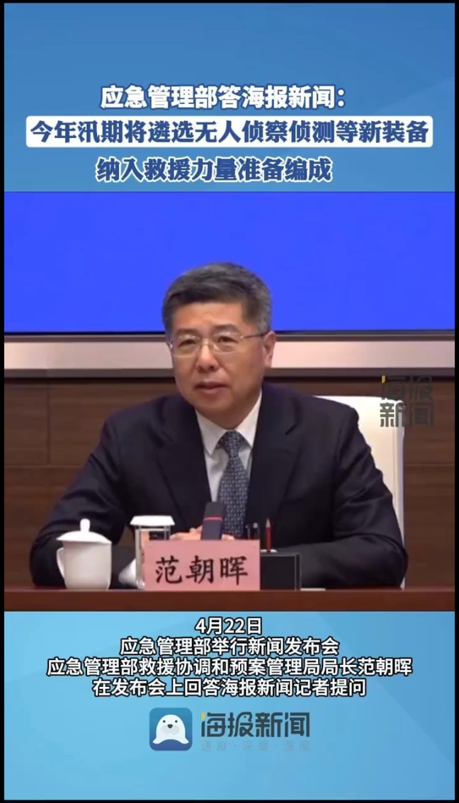 4月22日,应急管理部举行新闻发布会。应急管理部救援协调和预案管理局局长范朝晖在回答海报新闻记者提问时介绍,今年汛期,应急管理部坚持发挥新质救援能力优势,遴选一批无人侦察侦测、水陆两栖作业、大功率排涝、大载重投送、全地形机动等新装备纳入力量准备编成。