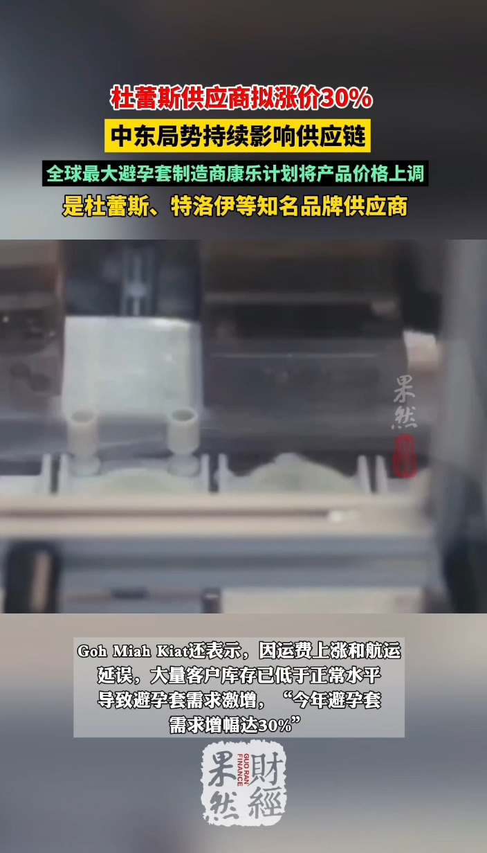 果然财经|杜蕾斯供应商拟涨价30%,中东局势持续影响供应链齐鲁壹点 | 16:13 原创齐鲁晚报·齐鲁壹点客户端 微信扫码扫码下载客户端据财联社4月22日报道,全球最大避孕套制造商康乐(Karex Bhd)首席执行官Goh Miah Kiat于周二表示,因中东局势持续影响供应链,公司计划将产品价格上调20%至30%,若供应链受阻局面长期持续,后续还可能进一步涨价。