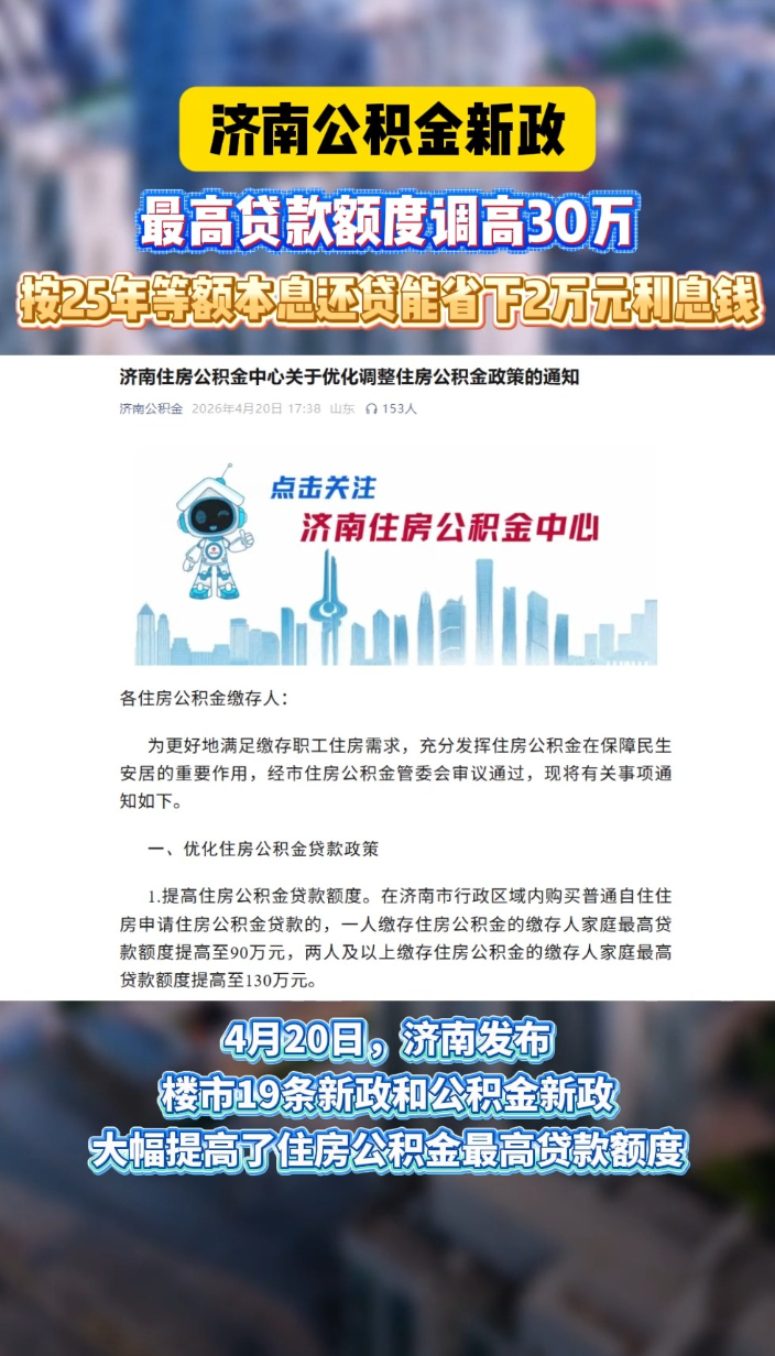 果然视频|济南公积金贷款额度增加30万,为买房人再省2万利息大众报业·齐鲁壹点 16:29(齐鲁晚报·齐鲁壹点记者 孟杰 王皇 樊瑞琳)4月20日,济南发布楼市19条新政和公积金新政,大幅提高了住房公积金最高贷款额度。一人缴存的职工家庭最高贷款额度由60万元提高到90万元;两人及以上缴存的职工家庭最高贷款额度由100万元提高到130万元。