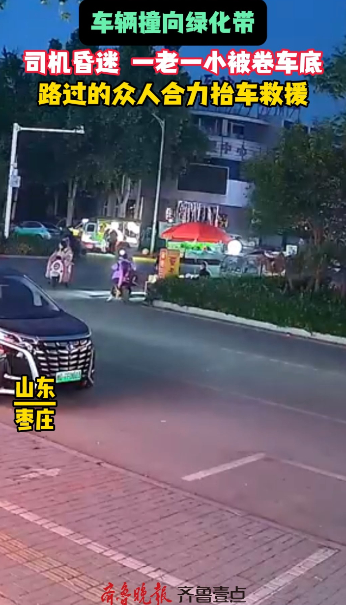 车辆撞向绿化带,一老一小被卷车底,路过的众人合力抬车救援