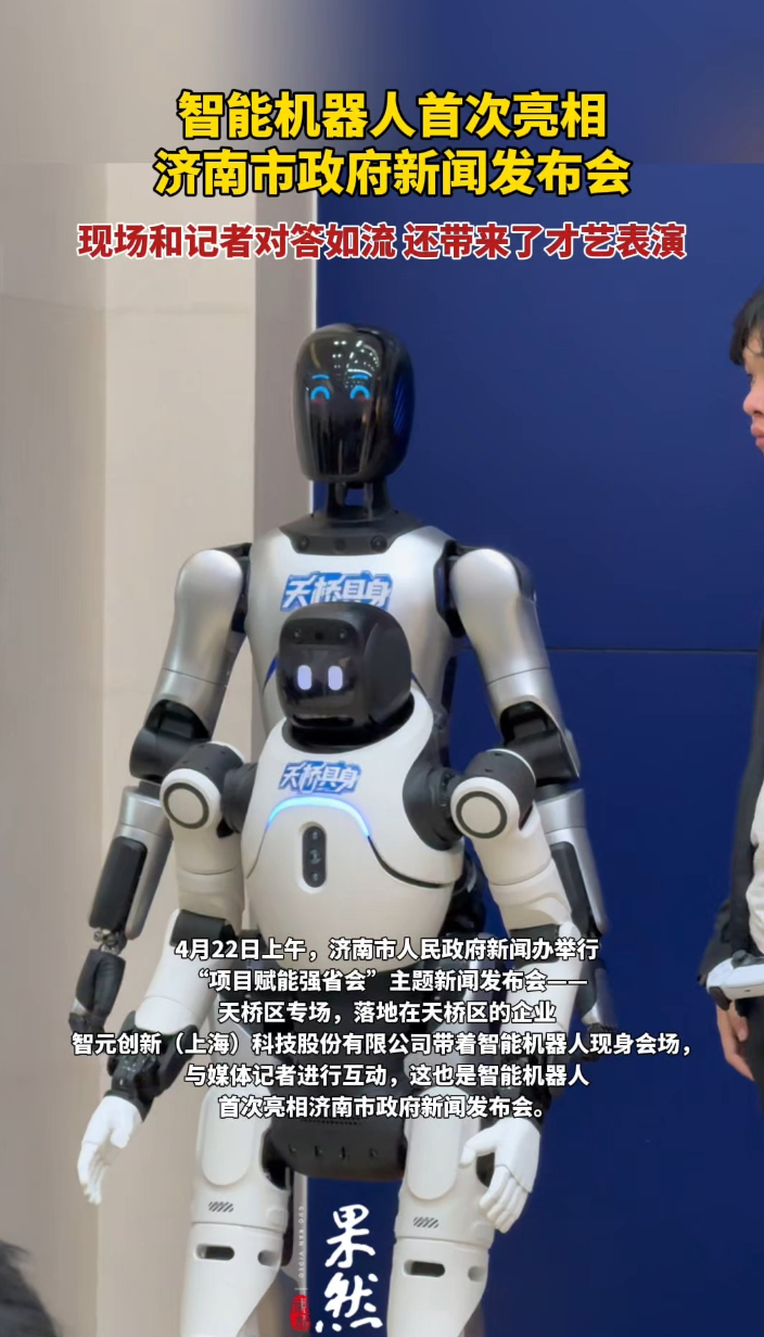 果然视频|智能机器人首次亮相济南市政府新闻发布会齐鲁晚报·齐鲁壹点客户端 09:23原创4月22日上午,济南市人民政府新闻办举行“项目赋能强省会”主题新闻发布会——天桥区专场,落地在天桥区的企业智元创新(上海)科技股份有限公司带着智能机器人现身会场,与媒体记者进行互动,这也是智能机器人首次亮相济南市政府新闻发布会。