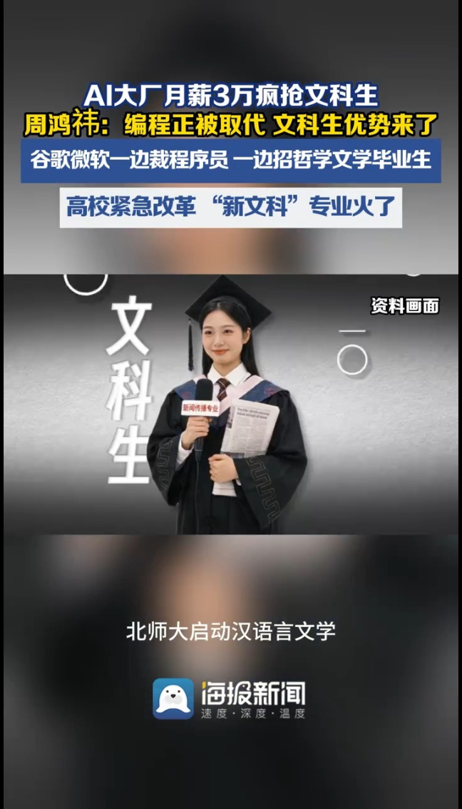 主播说丨AI大厂月薪3万疯抢文科生,周鸿祎:编程正被取代,文科生优势来了