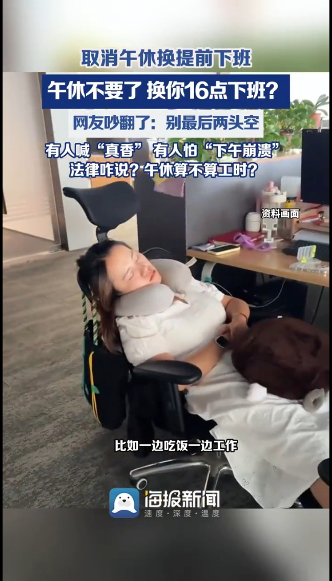 最近,“取消午休换提前下班”的话题登上了热搜。支持的网友说:中午吃饭半小时,下午4点就能走,避开晚高峰,真香!反对的网友表示:“中午不睡,下午崩溃”,尤其夏天扛不住。还有人说,别到最后既没午休又不能早下班。