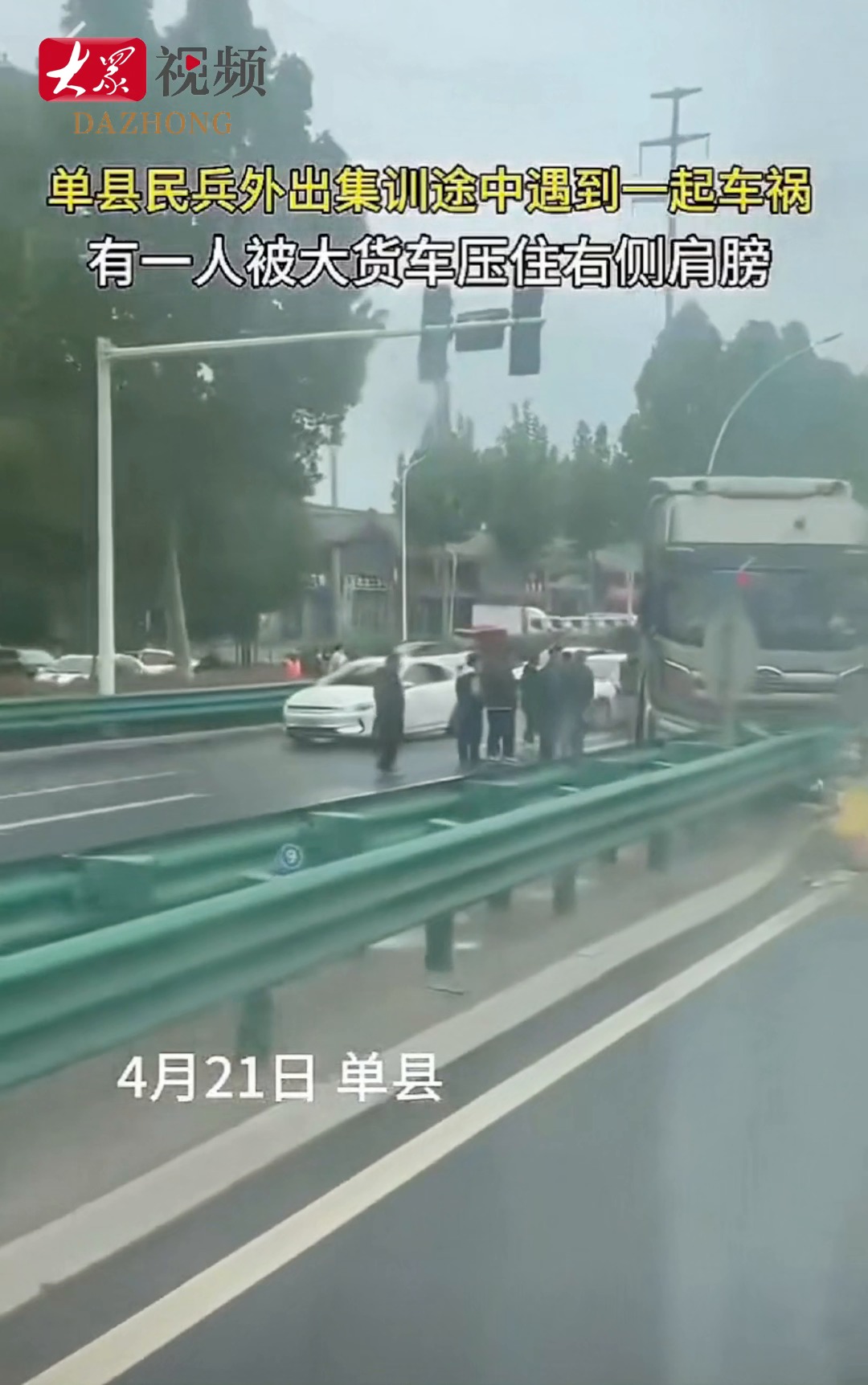 当天上午,单县民兵在外出集训途中,突遇一起交通事故。现场情况万分紧急:一名人员被大货车死死压住肩膀,动弹不得,随时可能有生命危险。