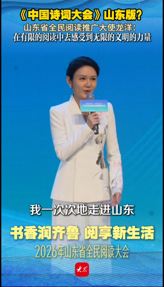 《中国诗词大会》山东版?央视主持人龙洋获聘山东省全民阅读推广大使大众新闻 15:32现场4月23日是第31个世界读书日。23日上午,2026年山东省全民阅读大会在潍坊举办。开幕式上,中央广播电视总台主持人龙洋,获聘山东省全民阅读推广大使。现场龙洋分享了个人的阅读感悟。(大众新闻记者 申家鑫 蓝天 王佳声 都镇强)