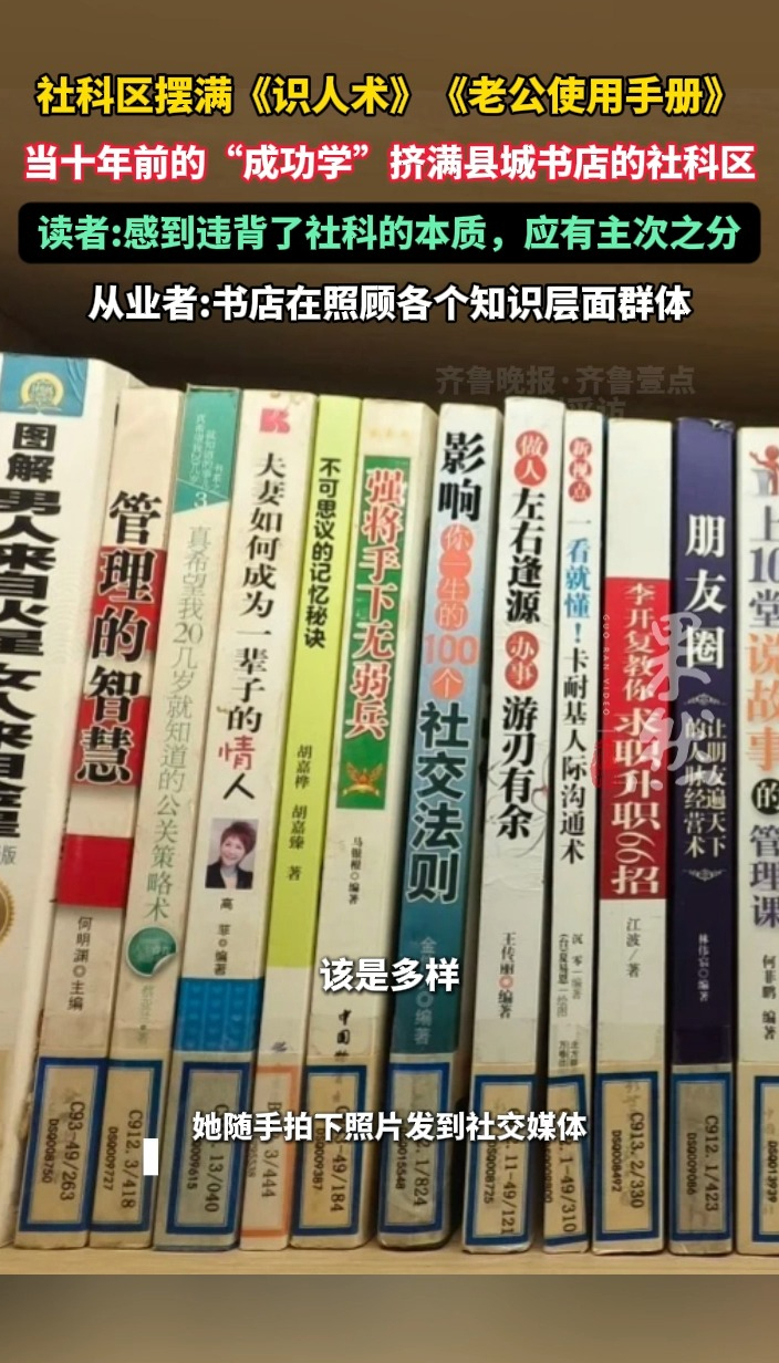近日,一名社会学专业的大学生回到浙江某县城,推开儿时常去的新华书店大门。走到标有“社会科学总论”的书架前,看到的却是《看穿人心识人术》《老公使用手册》拥挤地陈列在该标签之下。当“成功学”成为社科区的绝对主角,它折射出的是传统书店作为公共文化空间,多样性流失的无奈。(齐鲁晚报·齐鲁壹点爆料电话:0531-85193656;邮箱:405617016@qq.com)