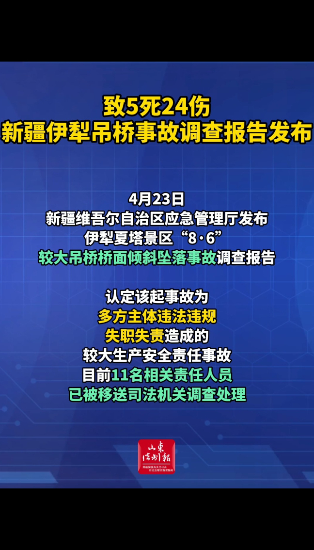 新疆维吾尔自治区应急管理厅发布伊犁夏塔景区“8·6”较大吊桥桥面倾斜坠落事故调查报告,认定该起事故为多方主体违法违规、失职失责造成的较大生产安全责任事故,目前11名相关责任人员已被移送司法机关调查处理。报告称,2025年8月6日,伊犁夏塔景区将军桥发生桥面倾斜坠落事故,造成5人死亡、24人受伤,直接经济损失2031.50万元。经事故调查组调查认定,该事故是一起因景区管委会违法违规建设、疏于监督管理,景区运营单位和涉事桥梁维修施工单位违规组织施工、未经验收投入使用,地方党委、政府及其有关部门履职不到位、隐患排查治理不认真不负责,吊桥类设施项目专项整治工作走过场,未认真汲取事故教训,多方主体违法违规、失职失责造成的较大生产安全责任事故。