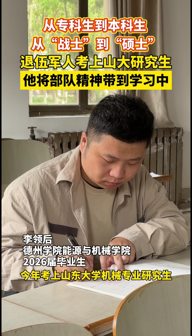 从专科生到本科生,从“战士”到“硕士” ,德州退役军人圆梦山大研究生大众新闻 | 19:53 原创大众新闻 微信扫码扫码下载客户端德州学院能源与机械学院2026届毕业生李领后,2019年考入青岛科技大学专科,后保留学籍应征入伍,2021年退伍复学,2024年通过专升本考入德州学院,今年成功考上山东大学研究生。(大众新闻记者 贺莹莹 德州晚报记者 孙学虎 赵祜昊)