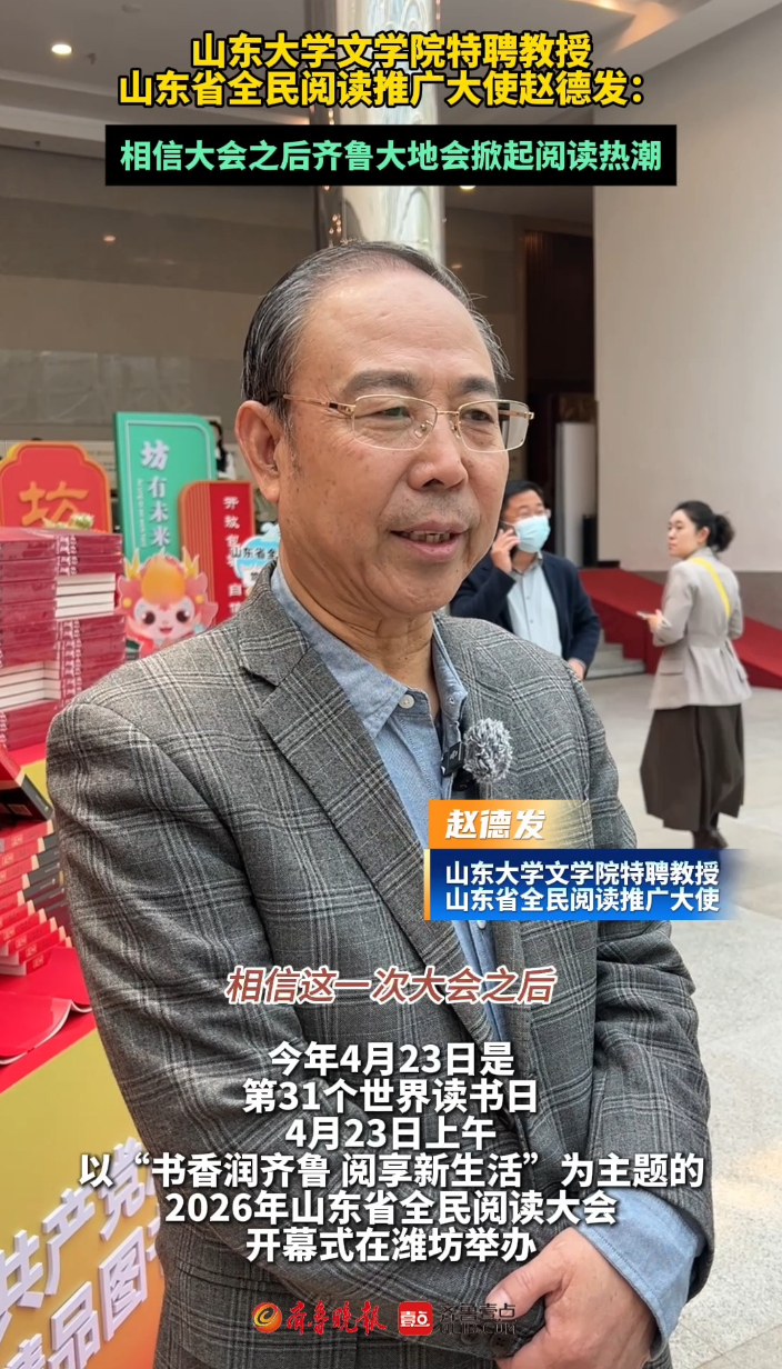 果然视频|赵德发:相信大会之后齐鲁大地会掀起阅读热潮齐鲁晚报·齐鲁壹点客户端 09:20原创今年4月23日是第31个世界读书日。4月23日上午,以“书香润齐鲁 阅享新生活”为主题的2026年山东省全民阅读大会开幕式在潍坊举办。山东省全民阅读推广大使赵德发相信,大会之后齐鲁大地上将掀起阅读热潮。 齐鲁晚报·齐鲁壹点 王钟玉