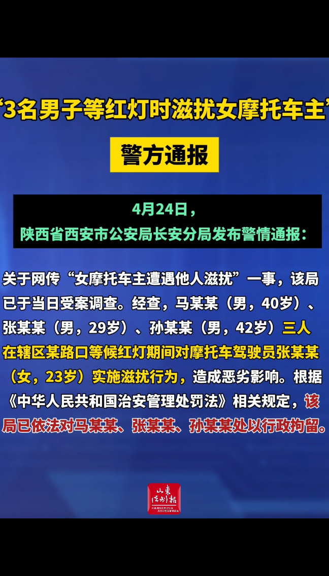“3名男子等红灯时滋扰女摩托车主”,警方通报 16:07 现场中国新闻周刊 微信扫码扫码下载客户端4月24日,陕西省西安市公安局长安分局发布警情通报:关于网传“女摩托车主遭遇他人滋扰”一事,该局已于当日受案调查。经查,马某某(男,40岁)、张某某(男,29岁)、孙某某(男,42岁)三人在辖区某路口等候红灯期间对摩托车驾驶员张某某(女,23岁)实施滋扰行为,造成恶劣影响。根据《中华人民共和国治安管理处罚法》相关规定,该局已依法对马某某、张某某、孙某某处以行政拘留。