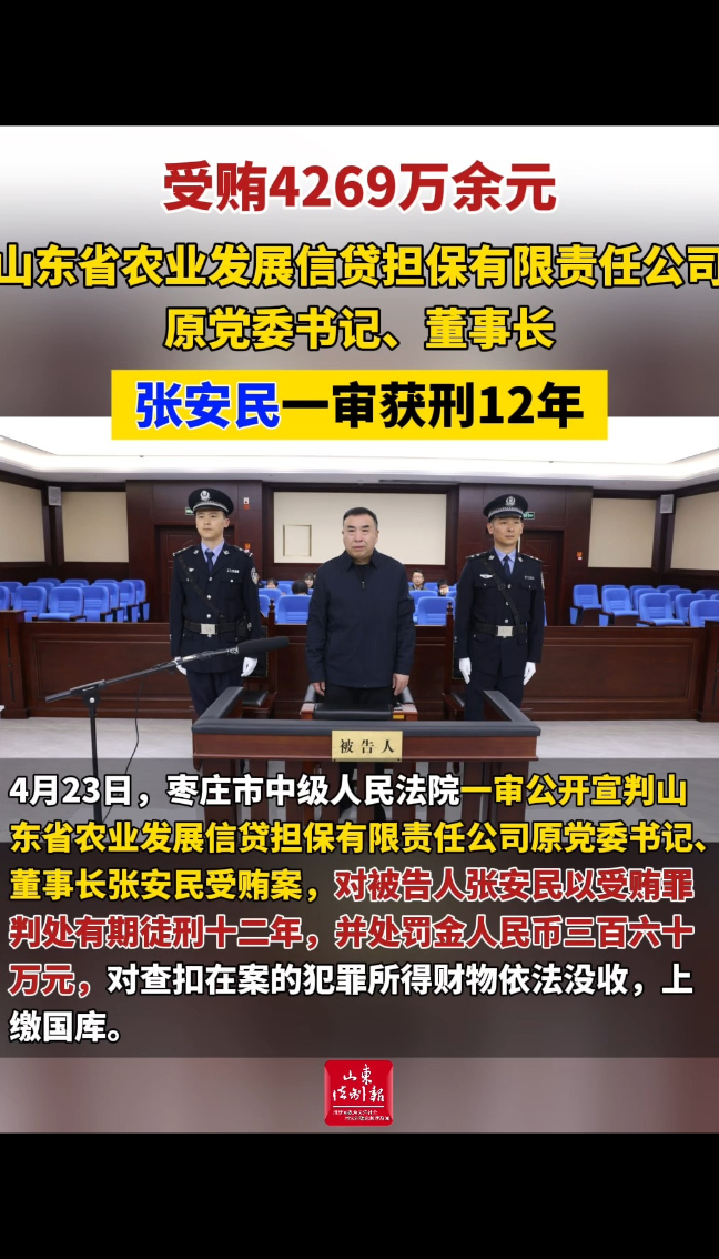 4月23日,枣庄市中级人民法院一审公开宣判山东省农业发展信贷担保有限责任公司原党委书记、董事长张安民受贿案,对被告人张安民以受贿罪判处有期徒刑十二年,并处罚金人民币三百六十万元,对查扣在案的犯罪所得财物依法没收,上缴国库。