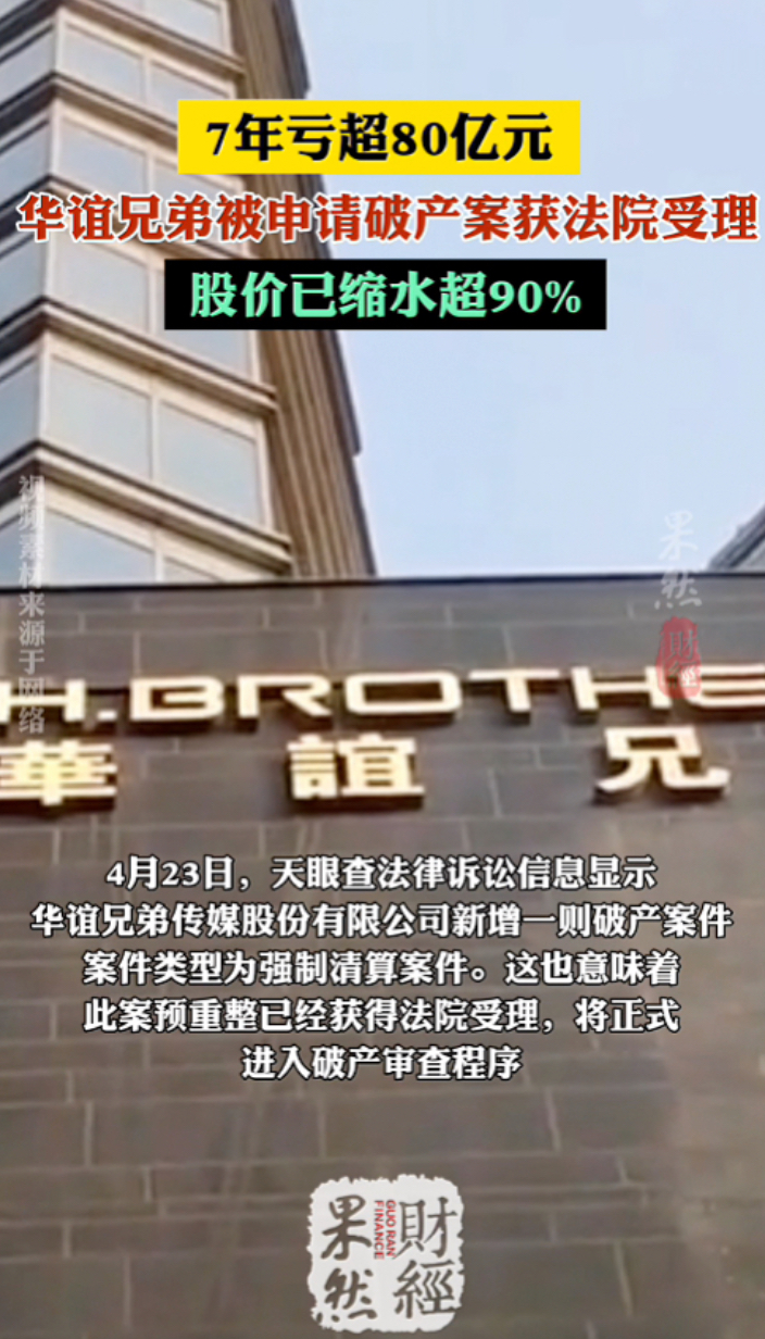 果然财经|华谊兄弟被申请破产案获法院受理,7年亏超80亿元 13:25 原创齐鲁晚报·齐鲁壹点客户端 微信扫码扫码下载客户端4月23日,天眼查法律诉讼信息显示,华谊兄弟传媒股份有限公司新增一则破产案件,案件类型为强制清算案件。这也意味着,此案预重整已经获得法院受理,将正式进入破产审查程序。据21世纪经济报道,自2018年首次出现年度亏损以来,华谊兄弟已连续多年深陷亏损泥潭,截至2024年底公司已经连续亏损7年,合计亏损达82.5亿元。