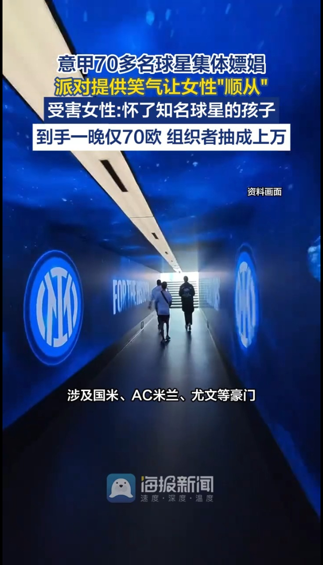 意大利米兰检方调查发现,超过70名意甲球员涉嫌参加集体嫖娼派对,涉及国米、AC米兰、尤文等豪门。派对组织者大量提供“笑气”活跃气氛,并让女性顺从。有受害女性爆料,自己怀上了一位“意甲知名球星”的孩子。而球员支付数千甚至上万欧元的“全包套餐”,女性一晚仅拿到70到100欧元。由于相关行为在意大利未违法,球员未被点名。但笑气被严格管控,目前,组织者因涉嫌剥削和协助卖淫被调查。