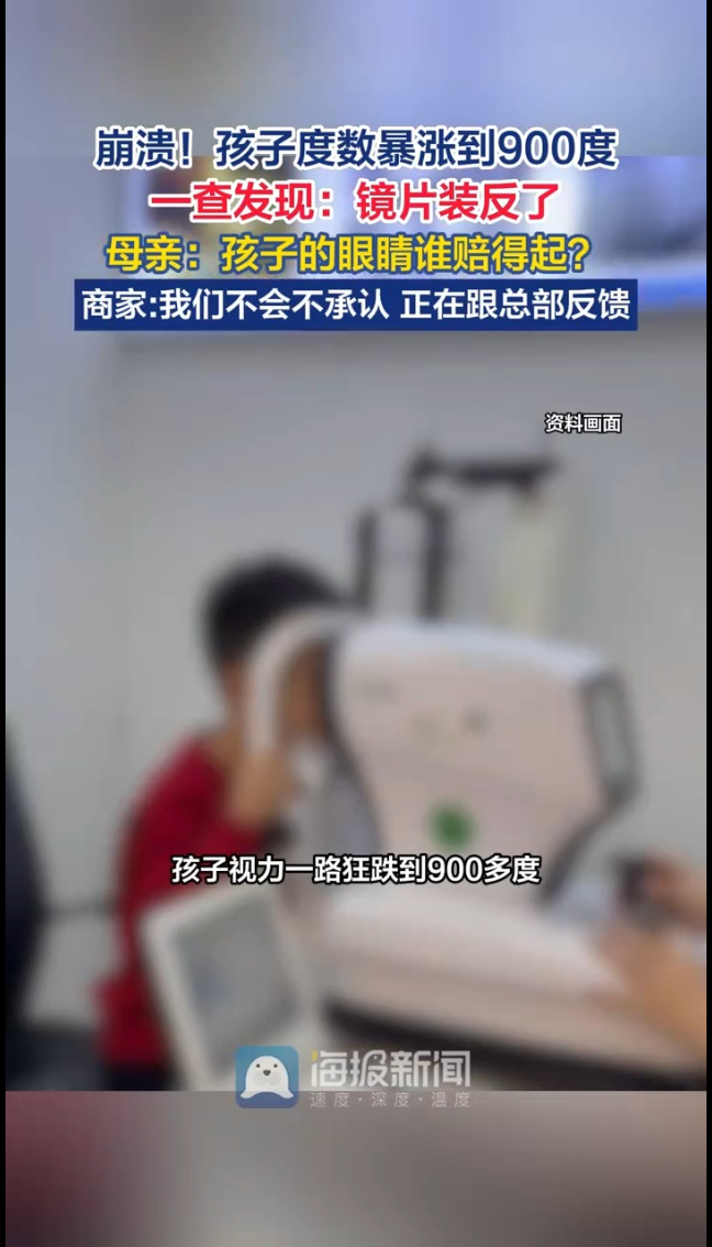 主播说丨崩溃!孩子度数暴涨到900度,一查发现:镜片装反了海报新闻 | 13:41 原创大众新闻·海报新闻 微信扫码扫码下载客户端一位母亲崩溃地发现,孩子视力一路狂跌到900多度,罪魁祸首竟是眼镜片装反了。她一直以为孩子眼睛在恶化,直到去另一家店重新验光,才得知真相。商家回应:“我们不会不承认,正在跟总部反馈。”母亲欲哭无泪:“孩子的眼睛,谁赔得起?”这一副装反的镜片,毁掉的不只是度数,更是孩子的未来。(海报新闻综合大参考 编辑 冯浩 张光 张坤)