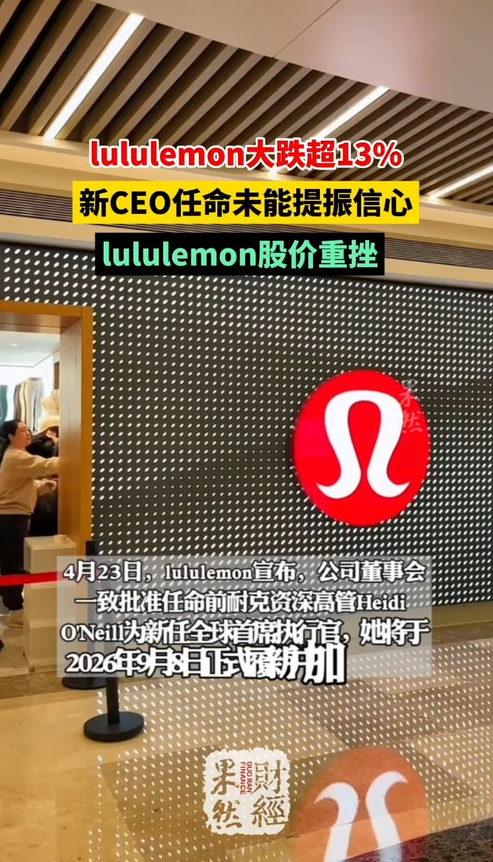 果然财经|lululemon大跌超13% 13:24 原创齐鲁晚报·齐鲁壹点客户端 微信扫码扫码下载客户端4月23日,lululemon宣布,公司董事会一致批准任命前耐克资深高管Heidi O'Neill为新任全球首席执行官,她将于2026年9月8日正式履新并加入董事会。然而,这一任命并未获得资本市场认可。消息公布后,lululemon股价接连下挫,截至当天收盘报141.66美元/股,跌幅达13.33%。