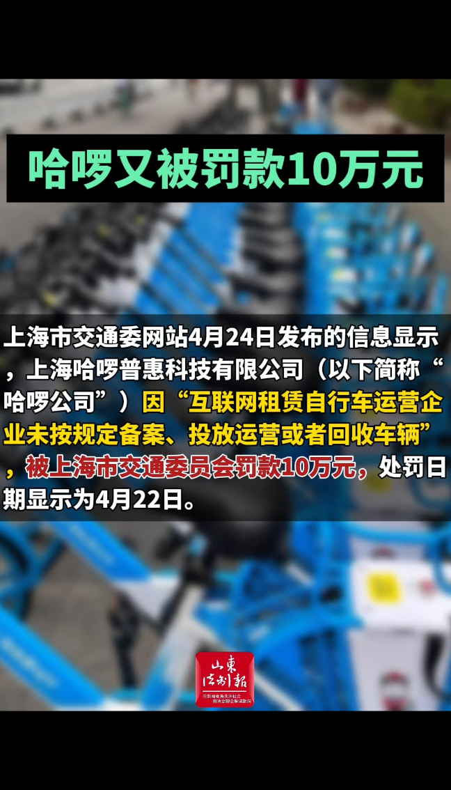 哈啰又被罚款10万元山东法制报 | 19:22 现场长安街知事 微信扫码扫码下载客户端上海市交通委网站4月24日发布的信息显示,上海哈啰普惠科技有限公司(以下简称“哈啰公司”)因“互联网租赁自行车运营企业未按规定备案、投放运营或者回收车辆”,被上海市交通委员会罚款10万元,处罚日期显示为4月22日。此外,今年1月,哈啰公司因同样问题被罚款10万元。