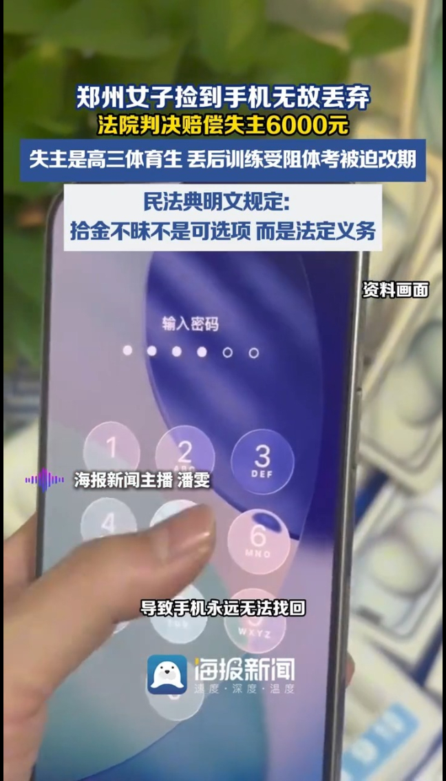 主播说丨郑州女子捡到手机无故丢弃,法院判决赔偿失主6000元