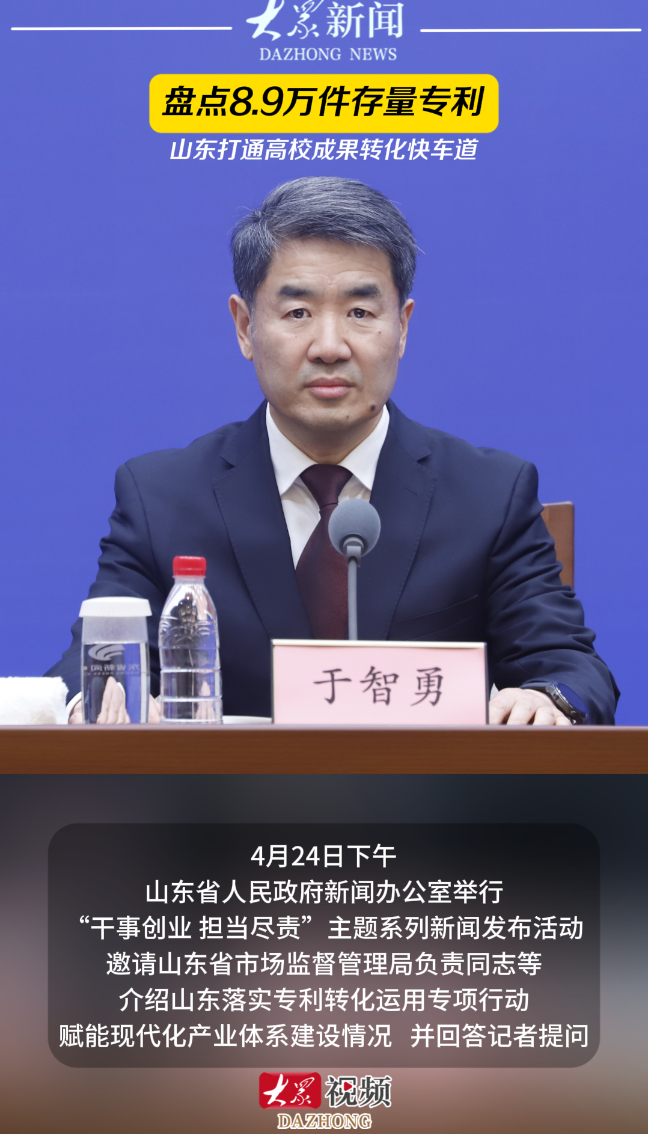 盘点8.9万件存量专利,山东打通高校成果转化快车道大众新闻 | 19:17 原创大众新闻·大众日报 微信扫码扫码下载客户端4月24日下午,山东省人民政府新闻办公室举行“干事创业 担当尽责”主题系列新闻发布活动,邀请山东省市场监督管理局负责同志等介绍山东落实专利转化运用专项行动,赋能现代化产业体系建设情况,并回答记者提问。(大众新闻记者 高广超 程文琪 策划 王雅洁)