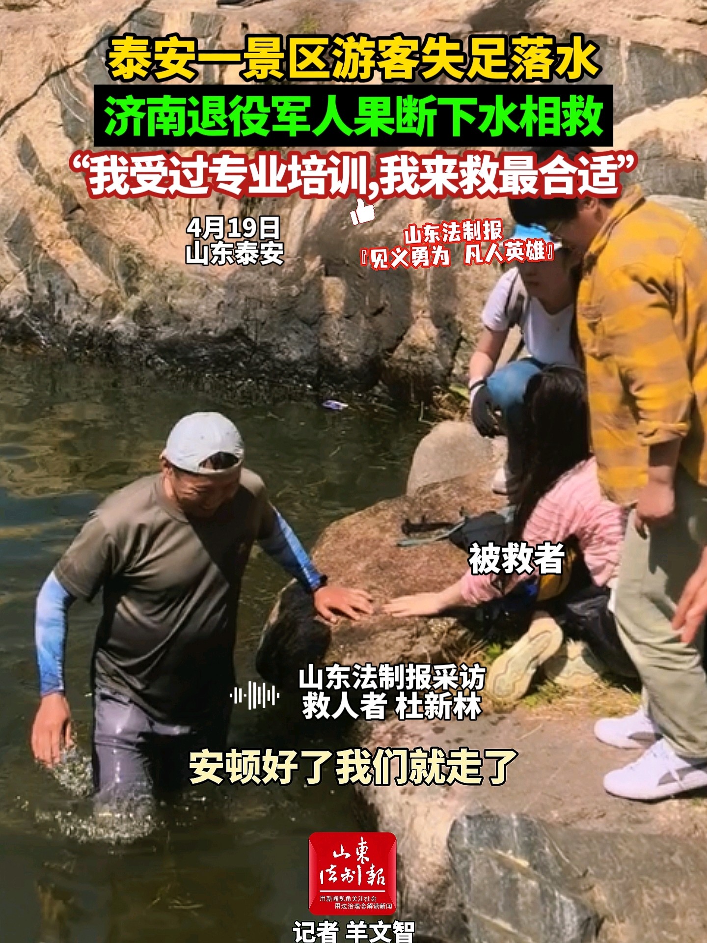 泰安一景区游客失足落水,济南退役军人果断下水相救,“我受过专业培训,我来救最合适”山东法制报 | 19:32 原创山东法制报 微信扫码扫码下载客户端4月19日中午,家住济南商河的杜新林在泰安一处景区游玩时,听到一名女孩失足落水的声响。他循声赶到现场,果断下水将人救起。事后,他在接受本报记者采访时表示:“我现在是一名户外领队,受过专业培训,又是退役军人,我来救最合适。”(大众新闻·山东法制报记者 羊文智)