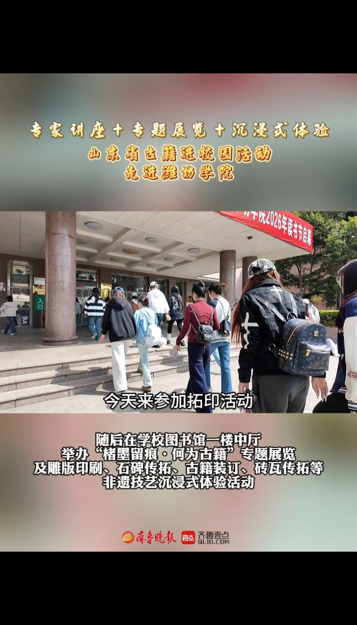 果然视频|“楮墨留痕·何为古籍”专题展览亮相潍坊学院图书馆齐鲁晚报·齐鲁壹点客户端 20:12原创4月23日上午,“2026年山东省古籍进校园”活动走进潍坊学院。山东省图书馆历史文献部副主任唐桂艳以《潍水书香:潍坊雕版印刷史探微》为题作专家讲座,随后在学校图书馆一楼中厅举办“楮墨留痕·何为古籍”专题展览及雕版印刷、石碑传拓、古籍装订、砖瓦传拓等非遗技艺沉浸式体验活动。潍坊学院约两千名师生参与,在亲手实践中感知齐鲁典籍文化脉络,增强古籍保护意识。 齐鲁晚报·齐鲁壹点 王佳潼