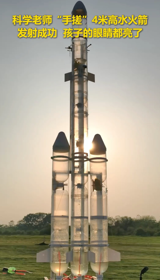 近日,江西吉安,科学老师用塑料桶“手搓”4米高水火箭。“火箭”发射腾空的那一刻,点燃了少年的航天梦!