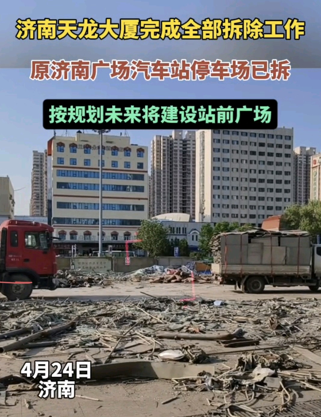 果然视频|济南天龙大厦完成全部拆除工作,未来将建站前广场齐鲁晚报·齐鲁壹点客户端 09:03原创4月24日下午,济南火车站南广场济南广场汽车站与天龙大厦的拆除工作已全部完成,现场视野变得格外开阔。 济南广场汽车站主体结构已基本拆除完毕,位于车站前方的停车棚已完全拆除,仅剩候车大厅尚未动工。与之相邻的天龙大厦目前仅剩基座部分,多台大型机械正在紧张作业,现场不时传来轰鸣声。(齐鲁晚报·齐鲁壹点 见习记者 冯子芯)
