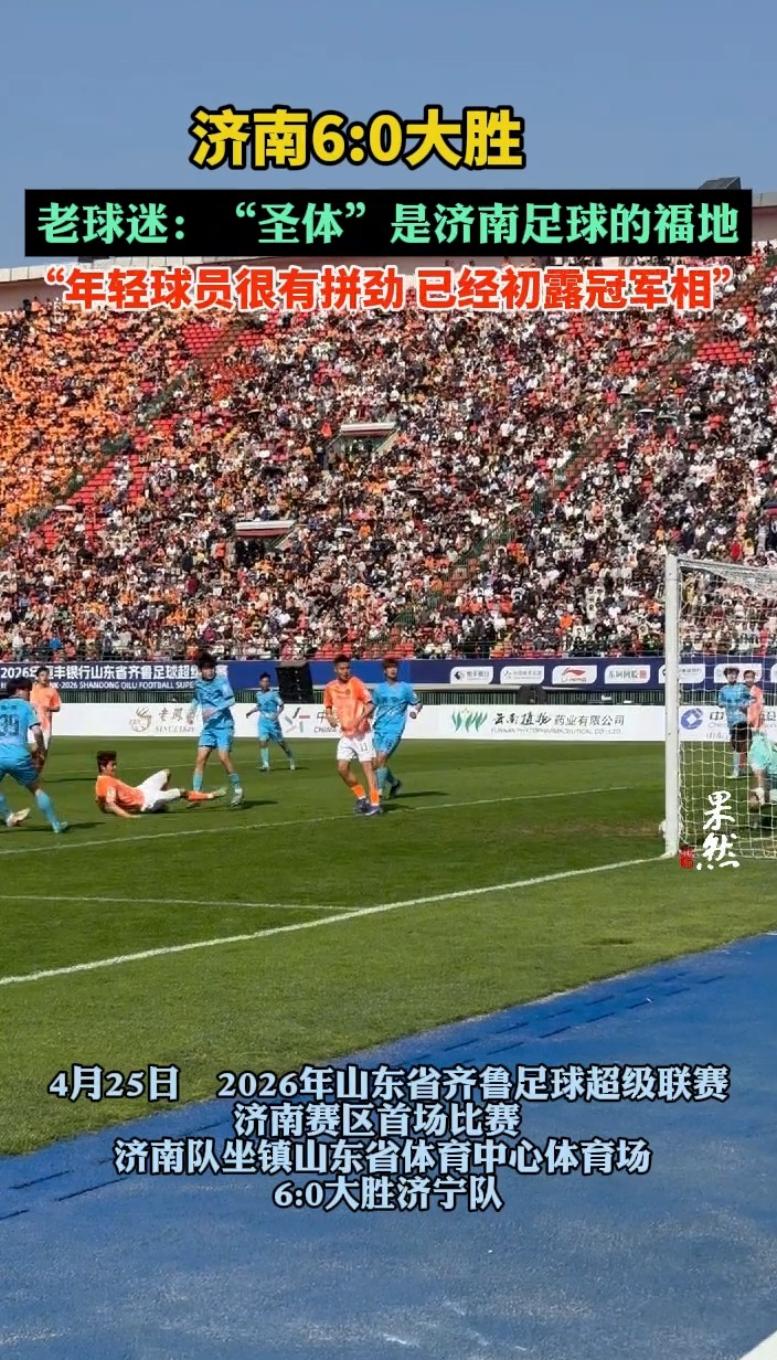 果然视频|济南6:0大胜,老球迷:“圣体”是济南足球的福地齐鲁晚报·齐鲁壹点客户端 昨天19:58原创4月25日,2026年山东省齐鲁足球超级联赛济南赛区首场比赛,济南队坐镇山东省体育中心体育场6:0大胜济宁队。济南的老球迷傅强告诉齐鲁晚报·齐鲁壹点记者,时隔多年重回省体,心情非常激动。“济南的年轻球员很有拼劲,我们已经初露冠军相。”