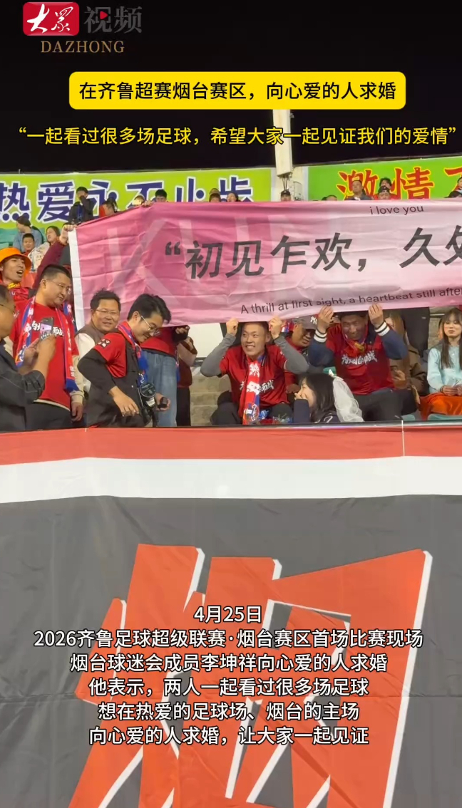 在齐鲁超赛烟台赛区,向心爱的人求婚 昨天21:22 现场大众新闻 微信扫码扫码下载客户端4月25日,2026齐鲁足球超级联赛·烟台赛区首场比赛现场,烟台球迷会成员李坤祥向心爱的人求婚。他表示,两人一起看过很多场足球,想在热爱的足球场、烟台的主场,向心爱的人求婚,让大家一起见证。(大众新闻记者 邢金钰)
