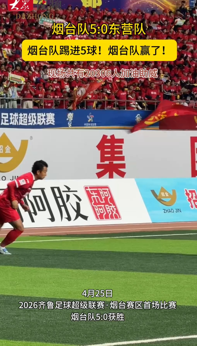 5:0!烟台队赢了!20306人到场加油助威!大众新闻 | 昨天21:29 现场大众新闻 微信扫码扫码下载客户端4月25日,2026齐鲁足球超级联赛·烟台赛区首场比赛在招远市开赛。本场比赛,烟台队踢进5球,以5:0的比分赢得胜利!据统计,共有20306人到场加油助威。(大众新闻记者 邢金钰)