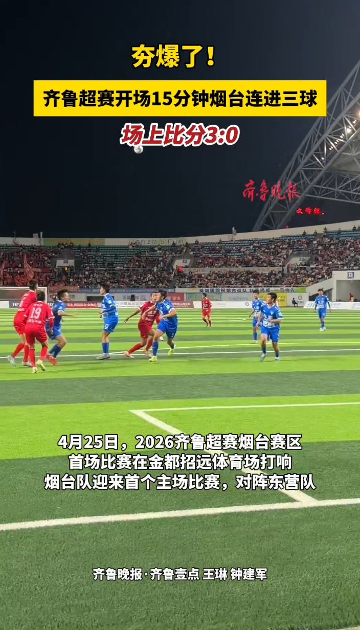 果然视频|3:0!齐鲁超赛开场15分钟烟台连进三球,夯爆了齐鲁晚报·齐鲁壹点客户端 昨天21:29原创4月25日,2026齐鲁超赛烟台赛区首场比赛在金都招远体育场打响,烟台队迎来首个主场比赛,对阵东营队。开场15分钟烟台连进三球,场上比分3:0。(齐鲁晚报·齐鲁壹点 王琳 钟建军)