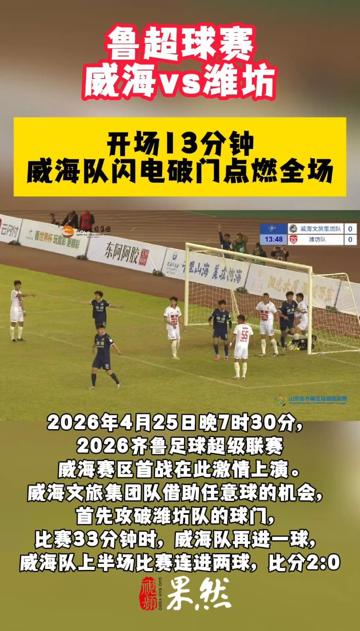 果然视频|威海队上半场连进两球,点燃全场热情大众报业·齐鲁壹点 昨天21:332026年4月25日晚7时30分,2026齐鲁足球超级联赛威海赛区首战在此激情上演。比赛刚开始13分钟,威海文旅集团队借助任意球的机会,首先攻破潍坊队的球门,比赛33分钟时,威海再进一球,威海队上半场比赛连进两球,比分2:0。 齐鲁晚报·齐鲁壹点 王震