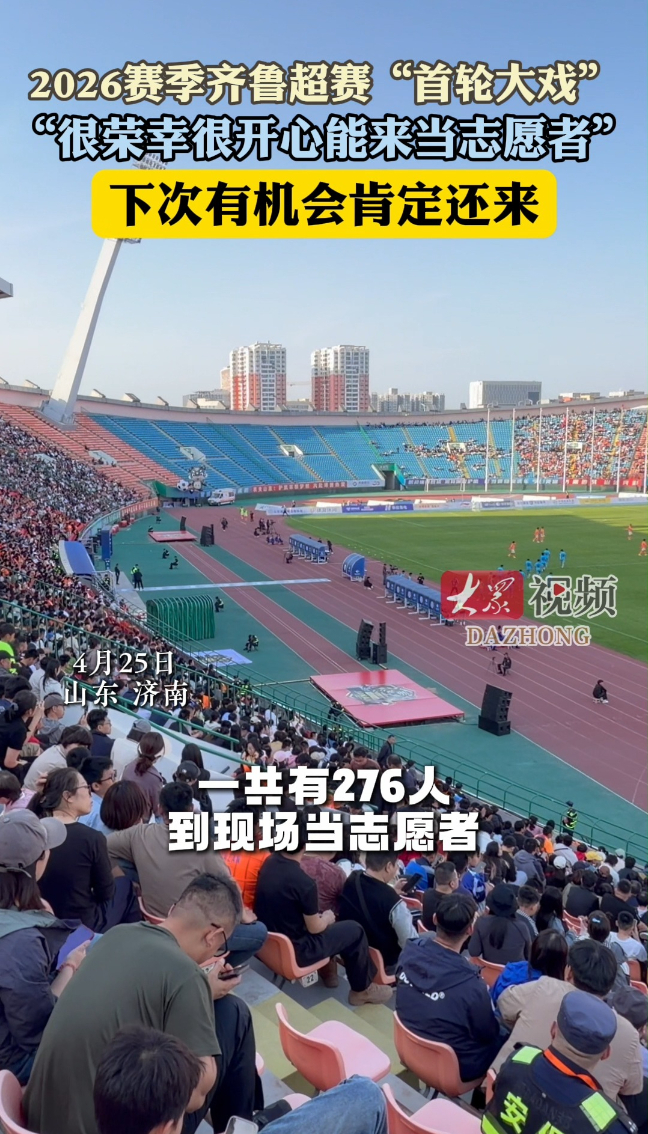 2026赛季齐鲁超赛“首轮大戏” 志愿者:服务、观赛两不误,下次还来!大众新闻 昨天22:04现场4月25日下午,“2026年山东省齐鲁足球超级联赛”济南赛区揭幕战在山东省体育中心体育场开打。来自济南工程职业技术学院的志愿者表示,有270多位到现场做志愿者,主要负责现场维护和安保,很荣幸很开心来这里当志愿者,还能有机会看球,下次有当志愿者的机会肯定还会再来。(大众新闻记者 程文琪 李亚平 吕乐 策划 王雅洁)