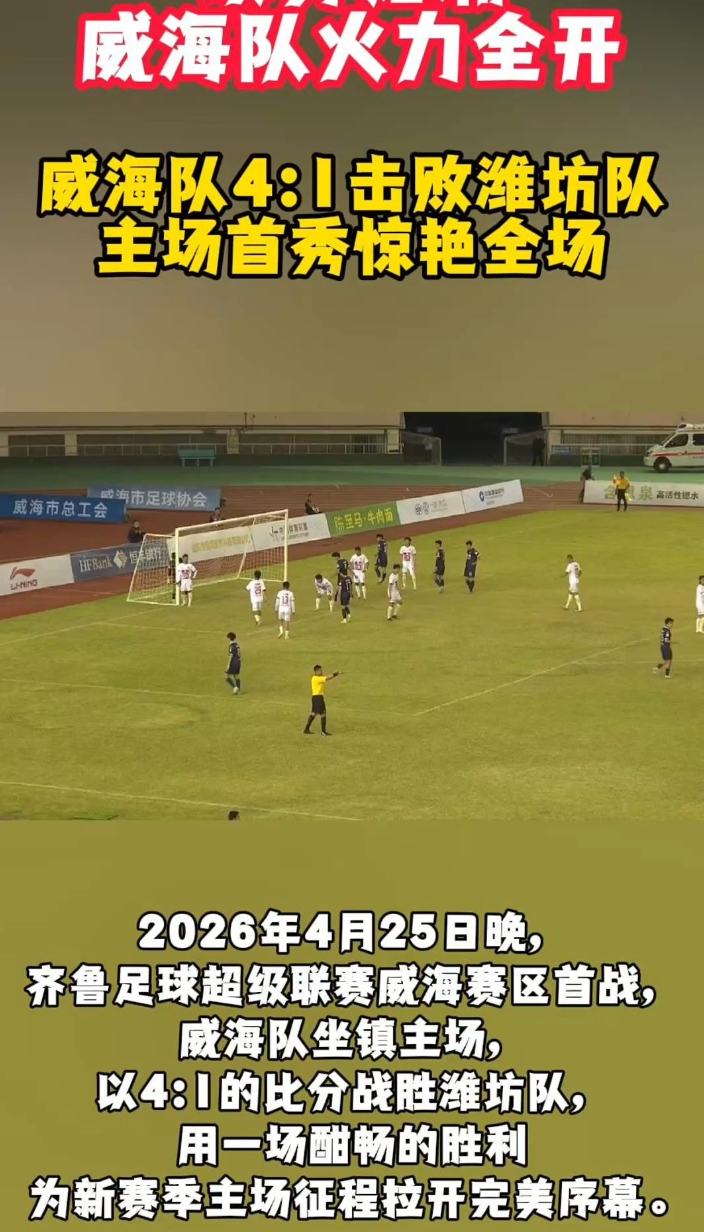 果然视频|威海文旅集团队4:1击败潍坊队,主场首秀惊艳全场大众报业·齐鲁壹点 昨天22:252026年4月25日晚,2026齐鲁足球超级联赛威海赛区首战,威海队坐镇主场,以4:1的比分战胜潍坊队,用一场酣畅的胜利为新赛季主场征程拉开完美序幕。 齐鲁晚报·齐鲁壹点 王震