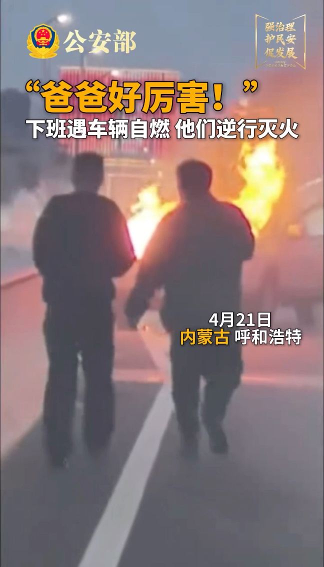 警察下班路上救了一场火,女儿说逆行的爸爸好厉害公安部 07:034月21日晚,内蒙古呼和浩特一车辆路边起火,火势迅猛。下班路过的民警巩兆贺和辅警邢泽,下车冲向起火车辆。经过合力紧急处置,现场明火最终被完全扑灭。邢泽的女儿趴在车窗边,看着爸爸勇敢救火的身影,大声喊着:“我的爸爸好厉害!”点赞!