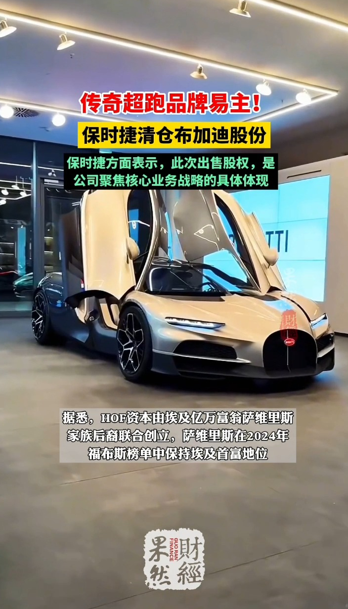 果然财经|传奇超跑品牌易主!保时捷清仓布加迪股份齐鲁壹点 | 11:53 原创齐鲁晚报·齐鲁壹点客户端 微信扫码扫码下载客户端当地时间4月24日,保时捷宣布将其持有的布加迪·锐马克(Bugatti Rimac)与锐马克集团(Rimac Group)全部股权,出售给由HOF资本牵头的国际财团,交易协议已于当日签署,预计2026年底前完成,最终以监管审批结果为准。