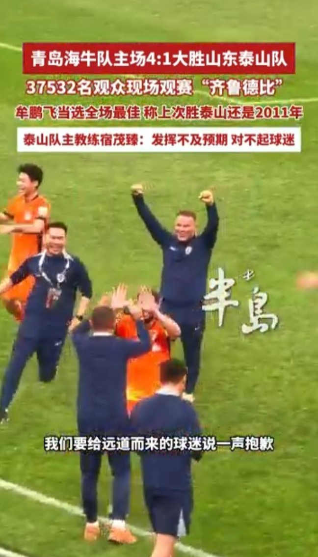 青岛海牛队主场4:1大胜山东泰山队 37532名观众现场观赛“齐鲁德比” 牟鹏飞当选全场最佳 称上次胜泰山还是2011年 泰山队主教练宿茂臻:发挥不及预期 对不起球迷大众新闻·半岛新闻 昨天20:55原创