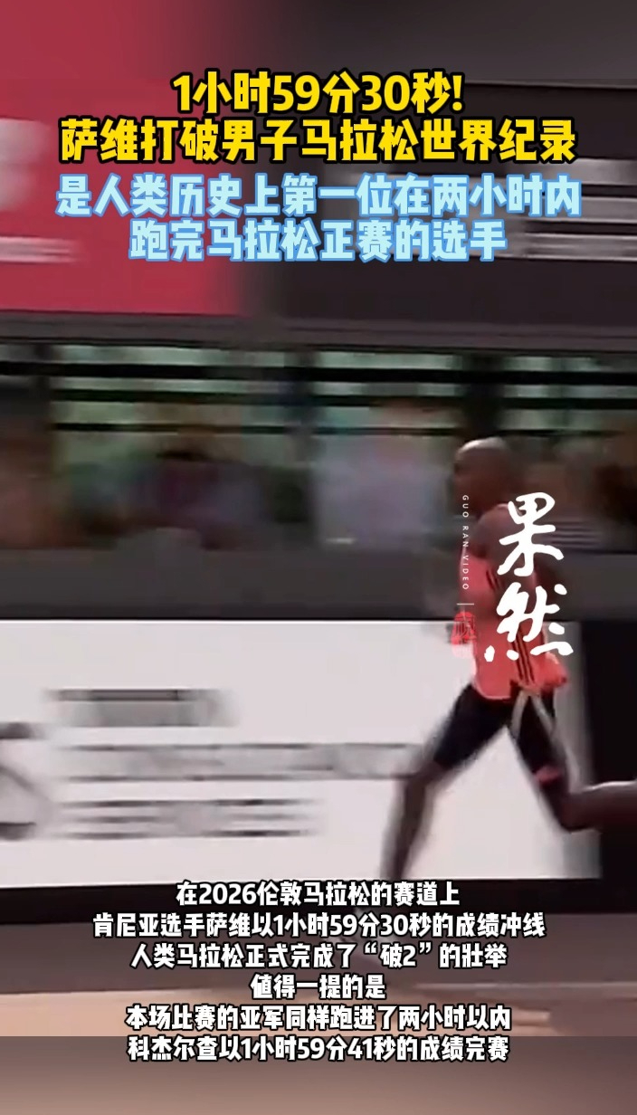 果然视频|1小时59分30秒!萨维打破男子马拉松世界纪录齐鲁晚报·齐鲁壹点客户端 20:06原创在2026伦敦马拉松的赛道上,肯尼亚选手萨维以1小时59分30秒的成绩冲线,人类马拉松正式完成了“破2”的壮举。值得一提的是,本场比赛的亚军同样跑进了两小时以内,科杰尔查以1小时59分41秒的成绩完赛。(齐鲁晚报·齐鲁壹点爆料电话:0531-85193656;邮箱:405617016@qq.com)