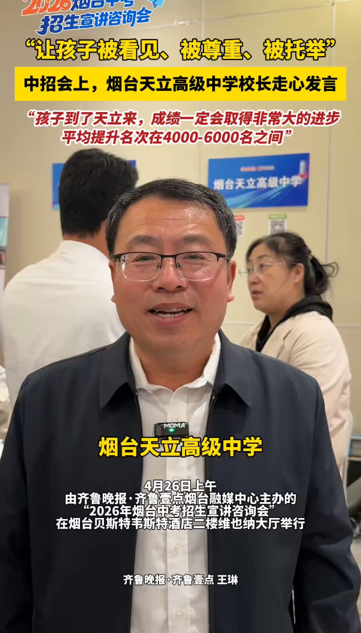 果然视频|高中校长中招会上走心发言:让孩子被看见被尊重被托举齐鲁晚报·齐鲁壹点客户端 昨天21:27原创4月26日上午,“2026年烟台中考招生宣讲咨询会” 在烟台贝斯特韦斯特酒店二楼维也纳大厅举行。“让孩子被看见、被尊重、被托举”,中招会上,烟台天立高级中学校长走心发言,“孩子到了天立来,成绩一定会取得非常大的进步,平均提升名次在4000-6000名之间 ”。 (齐鲁晚报·齐鲁壹点 王琳)