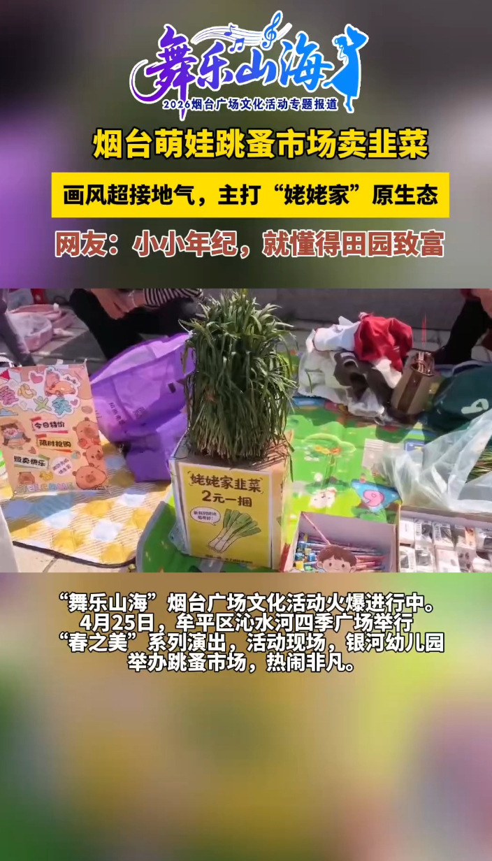 果然视频 | 烟台萌娃跳蚤市场上卖韭菜,主打“姥姥家”原生态齐鲁晚报·齐鲁壹点客户端 昨天21:26原创“舞乐山海”烟台广场文化活动火爆进行中。4月25日,牟平区沁水河四季广场“春之美”系列演出举行,银河幼儿园的师生、家长齐聚广场,开启亲子时光。(齐鲁晚报·齐鲁壹点 秦雪丽 于洋 实习生 刘璐欣)