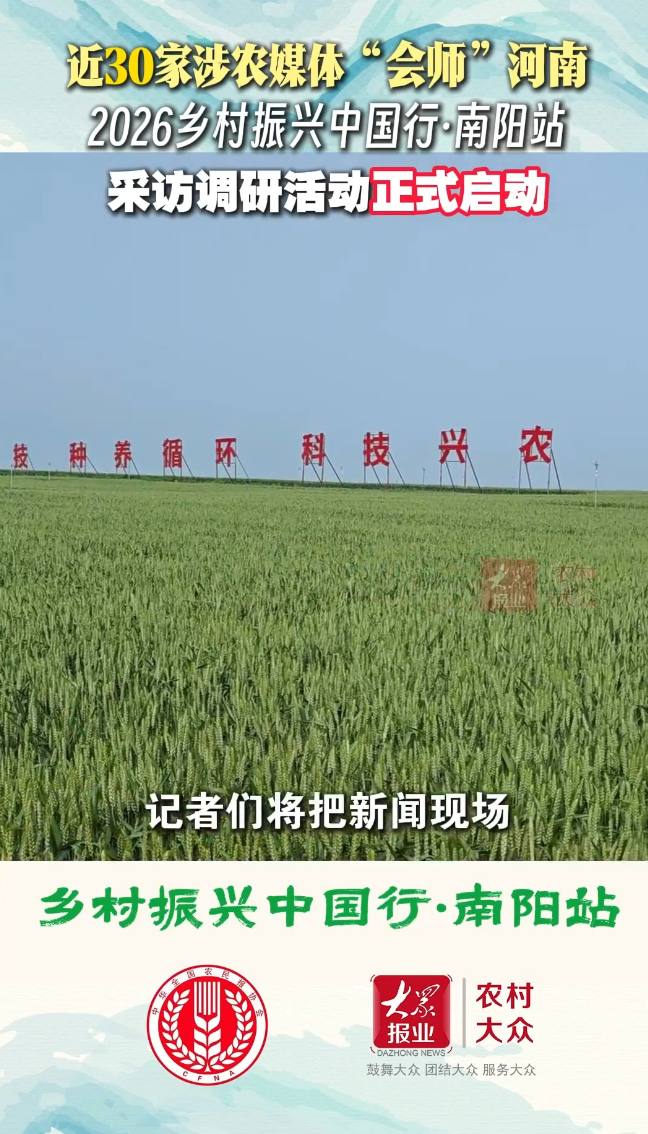走南阳 看振兴丨近30家涉农媒体“会师”河南,“2026乡村振兴中国行·南阳站”活动开幕大众新闻·农村大众 09:08原创4月26日,由中华全国农民报协会主办的乡村振兴中国行·南阳站采访调研活动正式启幕。近30家涉农媒体“会师”河南,从牧原智慧场区到一望无际的高标准农田,记者们将奔赴田野,把“新闻现场”搬到田野里,全方位多角度挖掘展现河南乡村振兴中的创新实践与卓越成效。(大众新闻·农村大众记者 李新宇)