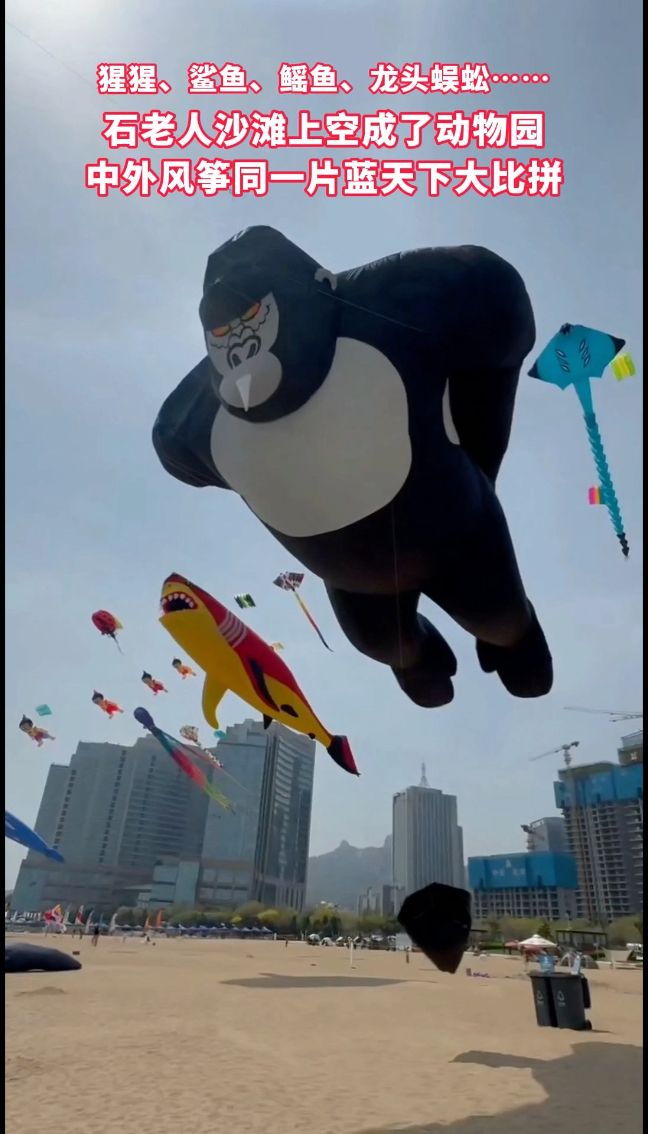 猩猩、鲨鱼、鳐鱼、龙头蜈蚣……石老人沙滩上空成了动物园,中外风筝同一片蓝天下大比拼