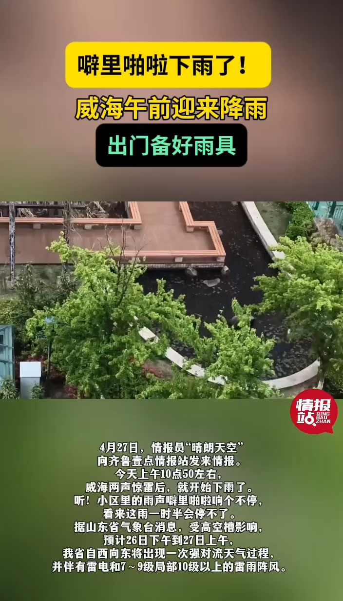 天气情报站|噼里啪啦下雨了!威海午前迎来降雨,出门备好雨具 11:34 大众报业·齐鲁壹点 微信扫码扫码下载客户端4月27日,情报员“晴朗天空”向齐鲁壹点情报站发来情报。27日上午10点50分左右,威海两声惊雷后,就开始下雨了。“听!小区里的雨声噼里啪啦响个不停,看来这雨一时半会停不了。”据山东省气象台消息,受高空槽影响,预计26日下午到27日上午,我省自西向东将出现一次强对流天气过程,并伴有雷电和7~9级局部10级以上的雷雨阵风。