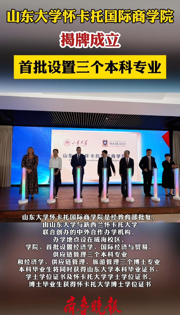 果然视频|山东大学怀卡托国际商学院揭牌成立大众报业·齐鲁壹点 14:104月27日上午,山东大学怀卡托国际商学院揭牌成立,山东大学怀卡托国际商学院是经教育部批复,由山东大学与新西兰怀卡托大学联合创办的中外合作办学机构,办学地点设在威海校区,学院、首批设置经济学、国际经济与贸易、供应链管理三个本科专业。 齐鲁晚报·齐鲁壹点 徐玉芹 王震